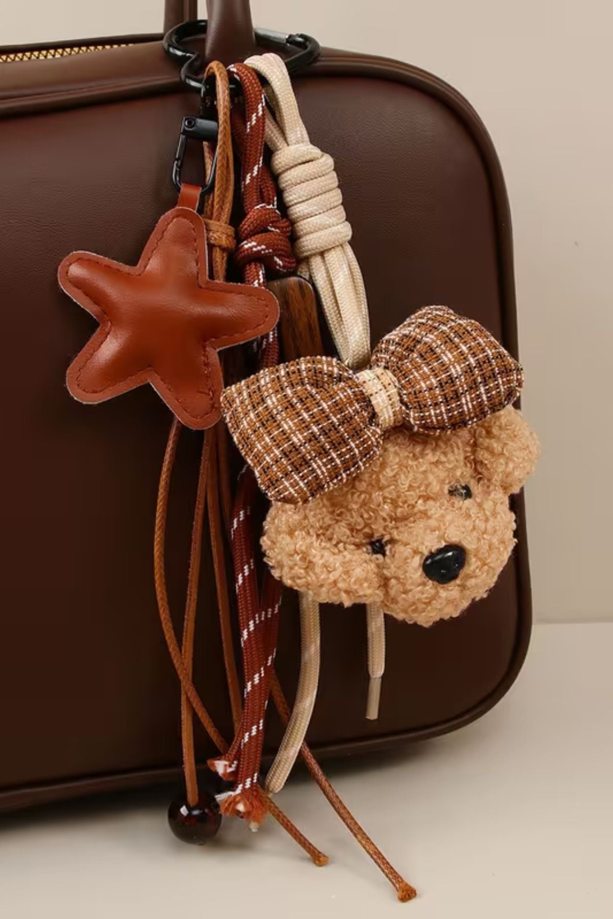 Bej Ayıcık Fiyonk Detaylı Charm Çanta Aksesuarları ve Anahtarlık (Çanta Dahil Değildir)