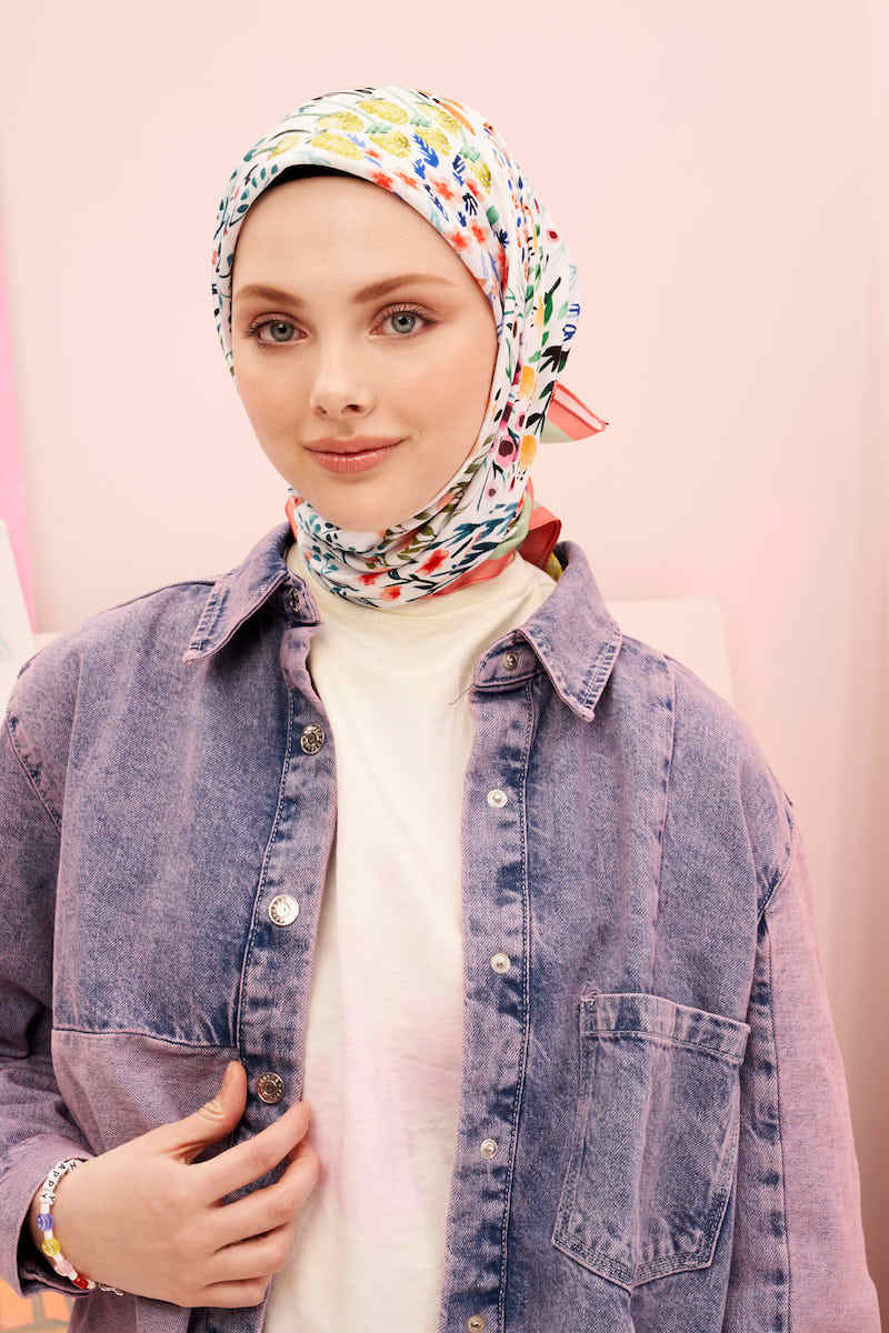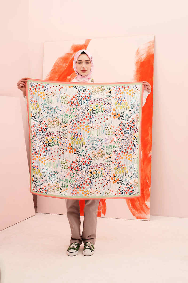 Çiçek Tarlası Desenli Twill Eşarp organik twill dokusu ile yaz aylarında rahatlıkla kullanabileceğiniz bir ürün.