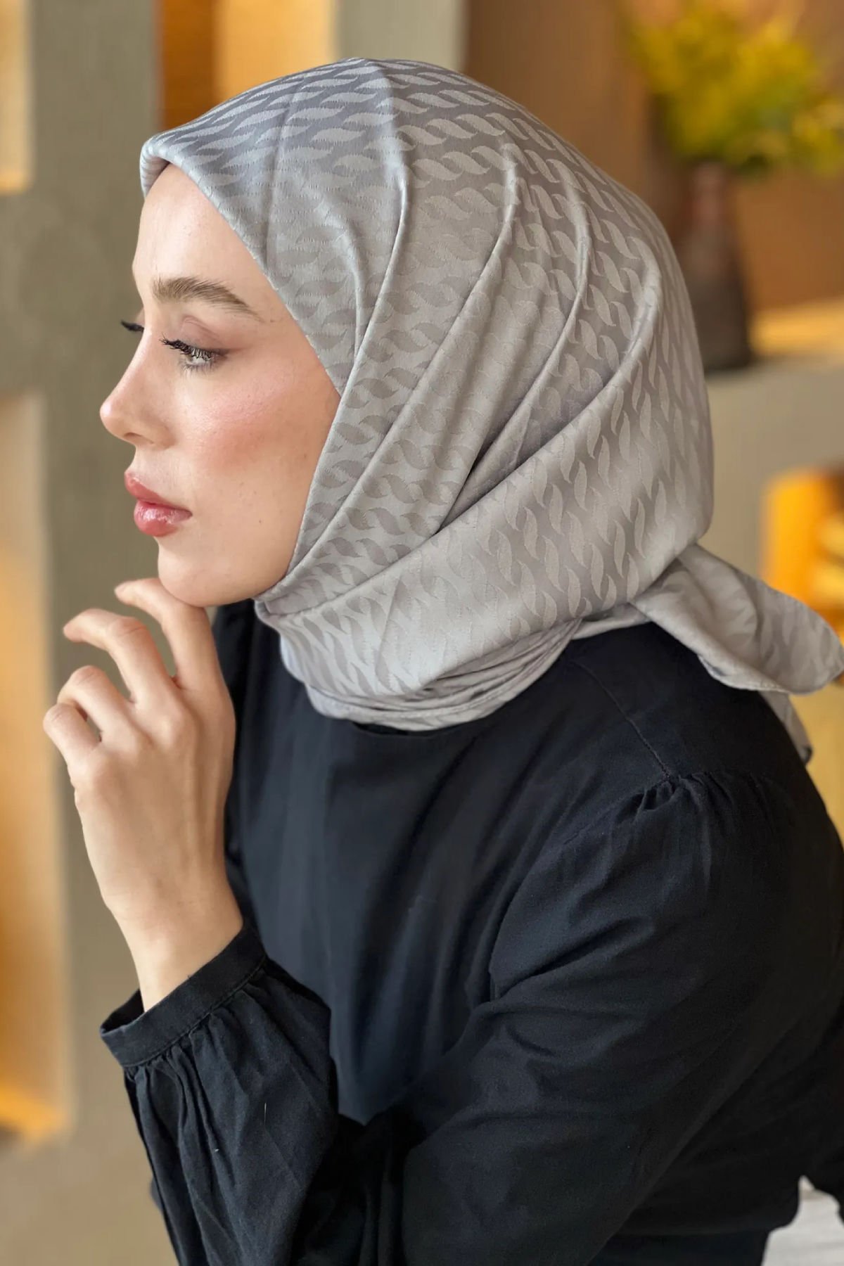 Modakaşmir ipeksi damla desenli jakar eşarp pamuklu dokusu sayesinde yumuşak, ipeksi ve başta ağırlık yapmaz. Kendinden desenli jakar dokumadır.