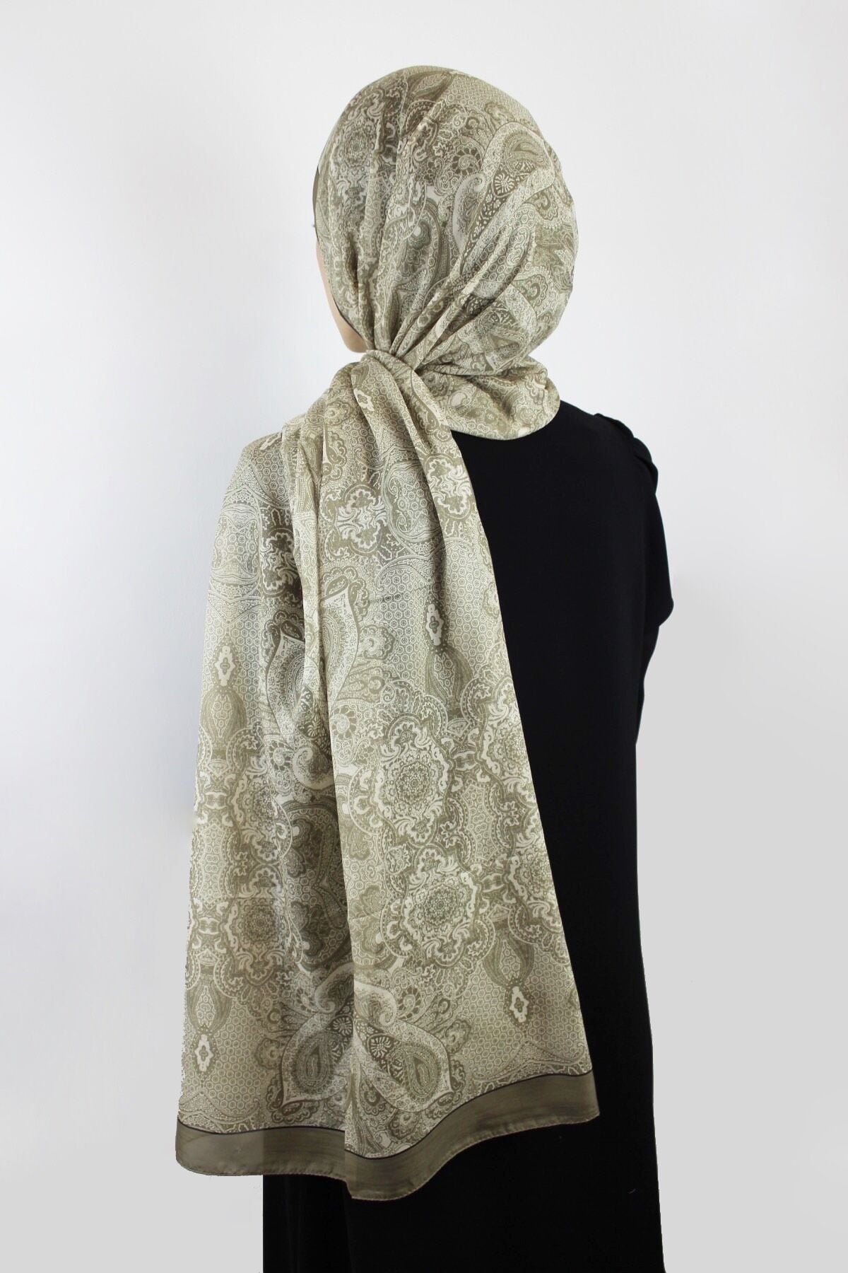 Etnik Desenli Vual İnce Pamuklu Şal - Zeytin