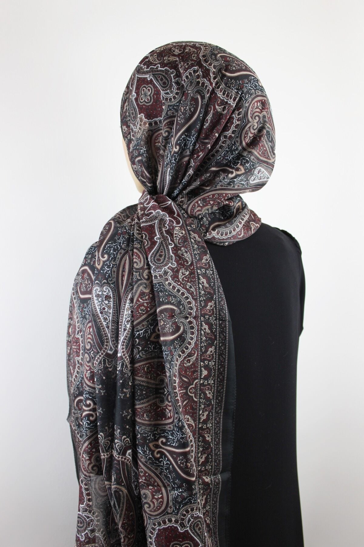 Etnik Klasik Desenli İnce Pamuklu Vual Şal - Siyah Bordo