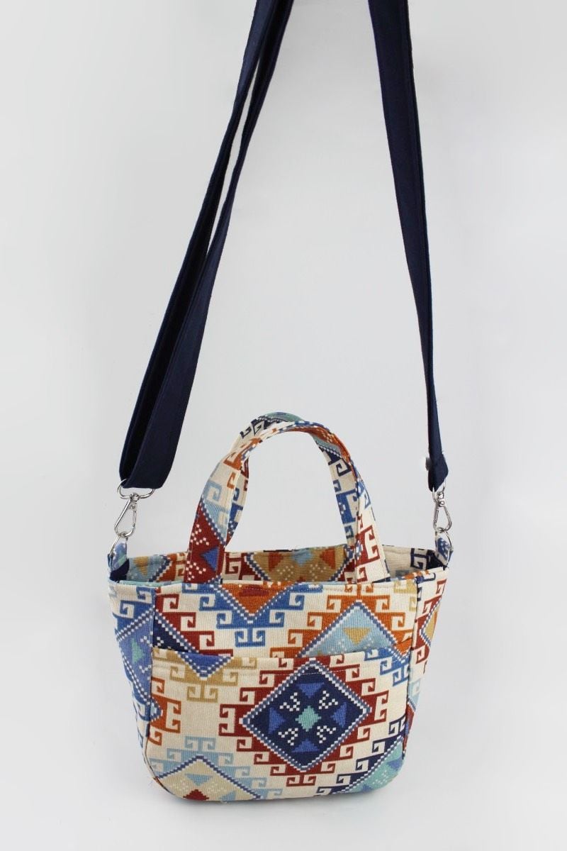 Kilim Desen Kot Kumaş Kadın Küçük Boy Çapraz Omuz Çantası günlük kullanım için uygundur. Ayarlanabilir omuz askılıdır.